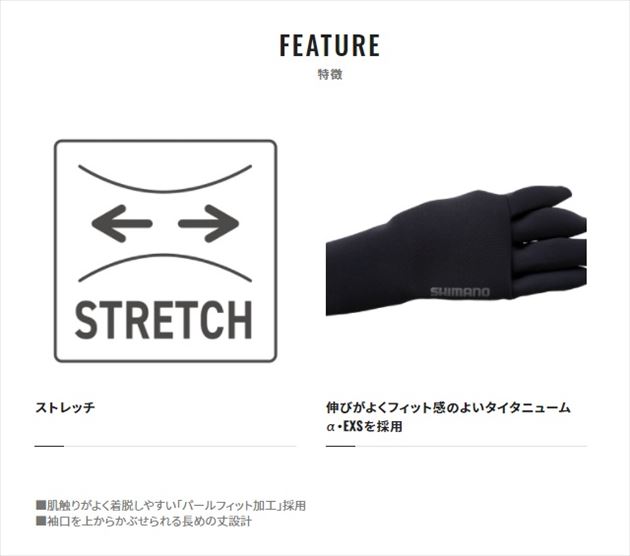 秋口から厳冬期のアングラーの手指を寒さから守るグローブ。冬の釣りは、寒さとの戦い。特に手先の冷えを辛いと感じるアングラーのため、断熱保温性の高いタイタニュームα・EXSを使用したグローブが新登場。保温性だけでなく、手にぴったりとフィットすることで防水性も高く、肌触りがよいが「パールフィット加工」を施すことで着脱も容易になった。グローブの丈も袖口を上からかぶせられるように長めに取られており、袖口からの冷気の侵入も防止。またこれまで多くのアングラーの悩みの種であった、グローブ装着による餌やルアー交換時の操作性低下も、指先をカットすることで保温性を保ちつつクリアしている。