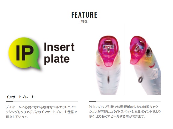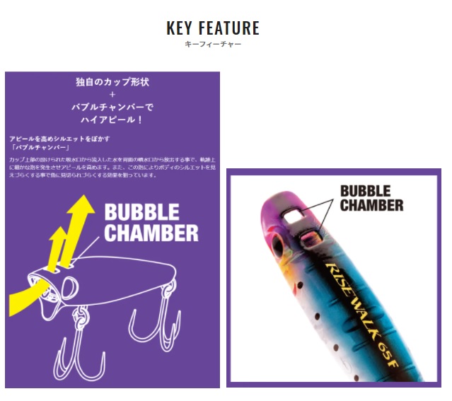 クイックな首振りアクション。トップウォーターのブリームゲームはどれだけバイトに持ち込めるか、そしてどれだけ掛けられるかがゲームの醍醐味です。ライズウォークの独自のカップ形状は移動距離の少ない首振りアクションを可能にします。バイトスポットとなるポイントでより多く、より長くアピールする事ができ、連続操作も容易なため、1投で複数回のバイトチャンスを作ります。