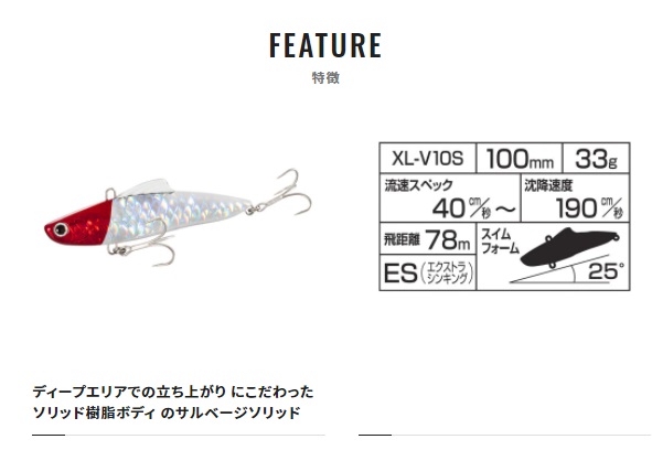 カラー:トウリンボラ タイプ:エクストラシンキング 全長(mm):100 自重(g):33 飛距離(m):78 沈降速度(cm/秒):190 スイムフォーム(角度(°)):25 ※実物と色が違って見える場合があります。あらかじめご了承下さい。