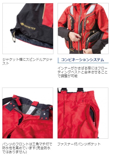 磯用ウェアの基本性能を搭載したゴアテックススーツ。※掲載している商品の画像は代表画像を表示しています。また実物と色が違って見える場合があります。あらかじめご了承下さい。 カラー:レッド サイズ:L 特徴:ゴアテックス.防水.透湿.撥水