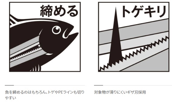 ブレードにギザ刃を搭載。様々な用途に使える万能ハサミ。●サビに強いフッ素加工済ステンレス製●魚を締めるのはもちろん、トゲやPEラインも切りやすい●対象物が滑りにくいギザ刃採用●握りやすさを追求したハンドル形状・素材(ソフト)