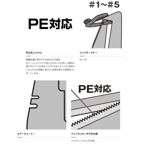 ●スプリットリングオープナー●ラインカッターギザ刃仕様(ナイロン・フロロ・PE対応)●片手で開閉可能なロック部●スリーブカシメ●握りやすいハンドル形状●ルアーアイチューナー●エンドロープ・ランヤード取付穴