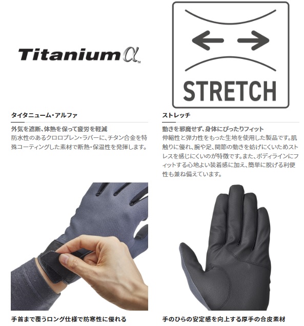 特に保温性を重視する方に向けたタイタニューム・アルファ採用の冬用汎用グローブ。保温性のあるタイタニューム・アルファに加え、手のひらには操作性だけでなく過酷な環境での使用を想定した耐久性を獲得するために合皮素材を採用。手のひら部分の合皮革を従来品と比べ厚くすることで安心感が向上しました。手首まで覆うロング仕様で防寒性にも優れています。手指の保温性を特に重視するアングラーに向けたフルカバー仕様です。