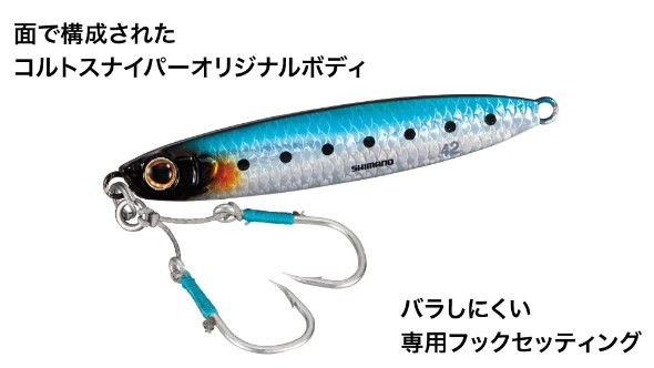 青物を中心に、ショアジグで狙える対象魚を絡め獲る様な高いフッキング性能で釣果UP!?各地で実績を積み重ねてきたコルトスナイパーオリジナルのボディを採用。軽いジャークでもクイックにスライド、フォール時の安定したバイブレーションで喰わせのスイッチを入れる設計です。