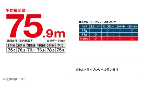 シャローエリア攻略の28g 一口サイズの遠浅専用設計。メタルドライブSR(シャローランナー)はボトムタッチしやすい遠浅サーフでも快適にメタルドライブをご使用いただくため、リトリーブでの浮き上がりやすさを重視して新設計しました。その結果シリーズ中最もレスポンスが良く、スローリトリーブでもしっかり泳ぐボディ設計となっています。
