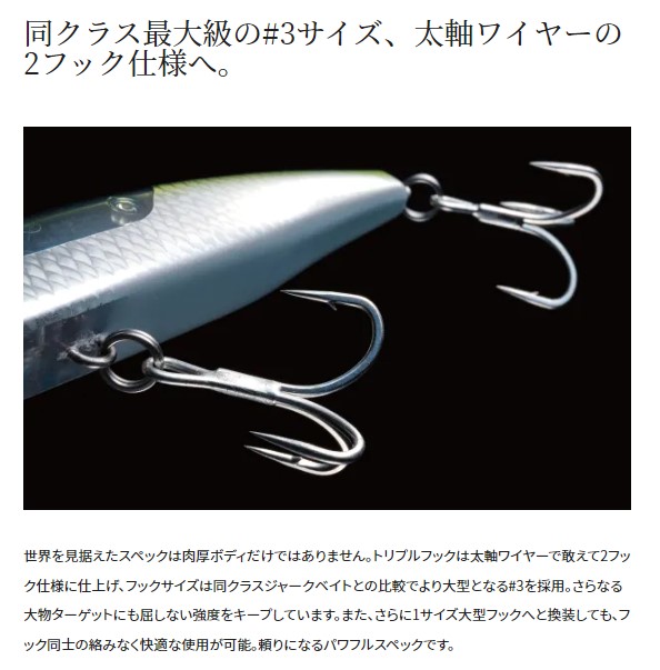 挑むは世界各地のフィッシュイーター「強さ」を追求した剛健ジャークベイト。アングラーの好奇心は常に水の中に注がれています。そこに国境や既成概念は存在せず、水面を挟んで人間と魚が対峙しているのみ。ワールドジャーク 110は、そんなボーダレスな釣りに心酔するアングラーのために作られた、タフで魅惑的なジャークベイトです。肉厚化を図ったボディと#3という大型フックの組み合わせは、あらゆる魚種に挑んでいけるストロング仕様。カラーはアピール力に優れる鮮やかなものから、ベイトフィッシュパターン対応のブルー系までフィッシュイーターを刺激する9種類を厳選しました。世界中のフィッシュイーターを狙い撃つ、「不撓」の精神を宿した110oのバーサタイルミノー。その実力をぜひご体感ください。