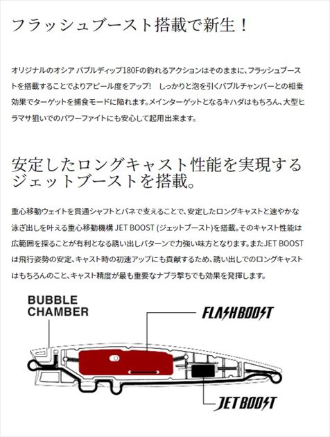 キハダ・ヒラマサの誘い出しに!ダイブもスプラッシュもこなすバブルディップ180Fにフラッシュブースト搭載。大きすぎないスプラッシュで気づかせ、ダイビングで喰わせる。ヒラマサやキハダゲームのメソッドに対応するのがバブルディップ180Fです。通常のペンシルベイトよりもスプラッシュが出しやすい小型カップは、ラフウォーターでもルアーの位置を把握しやすく、また、オフショアポッパーに比べて小さなスプラッシュはスモールベイトのナブラまでを想定して設計しています。もちろんルアーを動かさないステイ中やジャークの合間にも、フラッシュブーストのキラキラとしたフラッシングで誘い続けます。