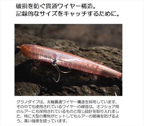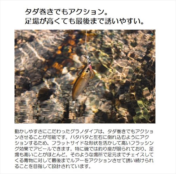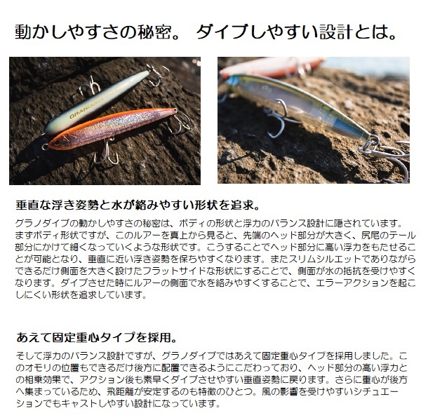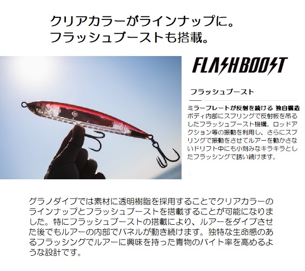 動かしやすさを追求。足元まで誘えるスリム系ペンシル。グラノダイブは、動かしやすさにこだわって設計されたダイビングペンシル。こだわりの浮力設定で誘い出しのアクションがさせやすく、波風で海面が荒れているようなシチュエーションでもエラーアクションを起こしにくいのが特徴です。またスリムシルエットなデザインにすることで、イワシやカマスなどの細身な魚が捕食されているシーンにもマッチします。そしてボディ素材には透明樹脂を採用。これまでコルトスナイパーシリーズのルアーにはなかったクリアカラーのラインナップと、高いフラッシング効果を誇るフラッシュブーストのテクノロジーも搭載されました。