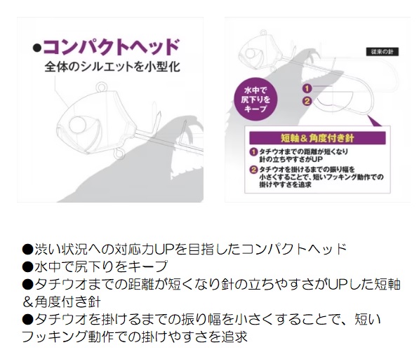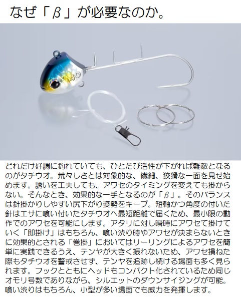 激戦区を制するコンパクト版テンヤの提案。それが「β」。大きなエサとテンヤがアピール力を発揮することがあるように、エサとテンヤのシルエットが小さいほうがタチウオに警戒されずアタリが出ることがあります。激戦区や喰い渋り時はとくにその傾向が顕著に見られ、エサとテンヤのサイズは誘いのテクニックと同様、ときにそれ以上に釣果を左右します。サーベルマスター船テンヤβはヘッドの小型化、フックの短軸化により誕生したコンパクトなタチウオテンヤ。水中では尻下がり姿勢をキープするため最小限の動作でのフッキングが可能、即掛けはもちろんロッドでアワセず、リールの巻きで掛ける「巻掛」にも最適です。カラーは定番から流行、各地方で威力を発揮するカラーまで、最新の情報を踏まえた全10色。号数は30、40、50号をラインナップ。全国に広がるテンヤタチウオシーンをカバーします。