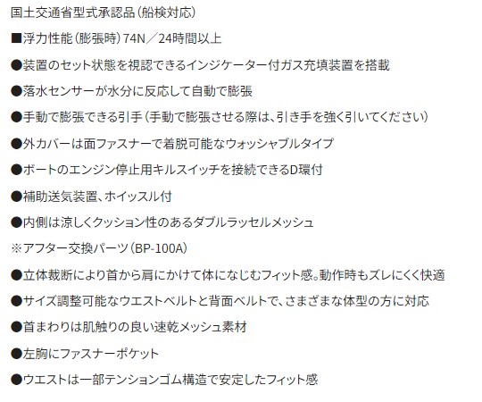 気室が取り外し可能で、洗濯できる膨脹式ベスト。気室が取り外し可能で、洗濯できるショルダータイプの膨脹式ベスト。※フローティングベストは国土交通省検査品レベルの基準をクリアする浮力性能を備えた製品です。※浮力性能(膨脹時)74N/24時間以上