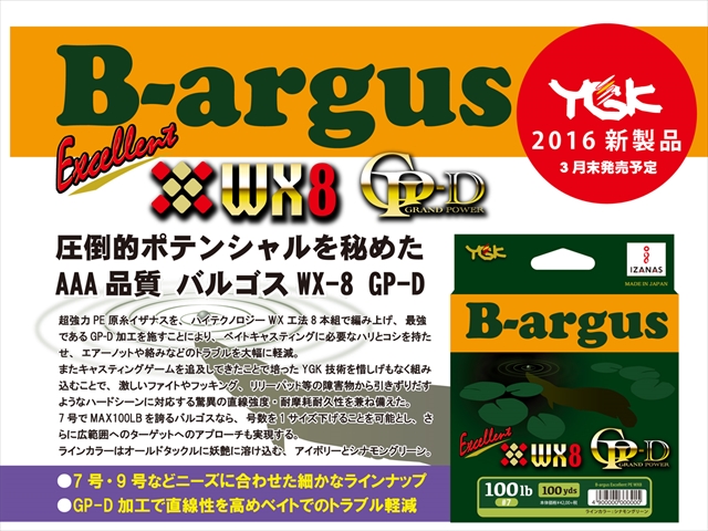 「圧倒的ポテンシャルを秘めたAAA品質バルゴスWX-8 GP-D」 超強力PE原糸イザナスを、ハイテクノロジーWX工法8本組で編み上げ、最強であるGP-D加工を施すことにより、ベイトキャスティングに必要なハリとコシを持たせ、エアーノットや絡みなどのトラブルを大幅に軽減。またキャスティングゲームを追及してきたことで培ったYGK技術を惜しげもなく組み込むことで、激しいファイトやフッキング、リリーパッド等の障害物から引きずりだすようなハードシーンに対応する驚異の直線強度・耐摩耗性を兼ね備えた。7号でMAX100※掲載している商品の画像は代表画像を表示しています。また実物と色が違って見える場合があります。あらかじめご了承下さい。※掲載している商品の画像は代表画像を表示しています。また実物と色が違って見える場合があります。あらかじめご了承下さい。