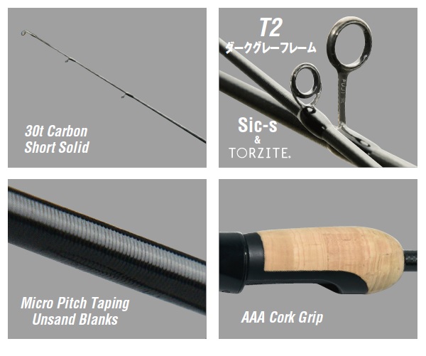 ティップタイプ:カーボンソリッド 全長:188cm 自重:53g リグウエイト:0.6〜1.5g ライン(MONO):0.8〜2lb ※バットガイドから2個はトルザイトリング、それ以外の6個(チョーク・ティップガイド群・トップ)はSicリング