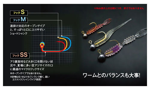 ●細くても強い!鋭い刺さりと針先が鈍りにくく長持ちするハイカーボン素材フックを使用。●ラウンドベースのヘッドで飛距離が出せ、斜め上に引くことを考慮した水受け断面で軽量でも操作感が高い!●S・Mは速掛け対応のオープンゲイプ、SSは小さなアタリに対し刺さりをフォローする針先ネムリ使用●すっぽり口に入りやすいショートシャンク。 ※掲載している商品の画像は代表画像を表示しています。また実物と色が違って見える場合があります。あらかじめご了承下さい。