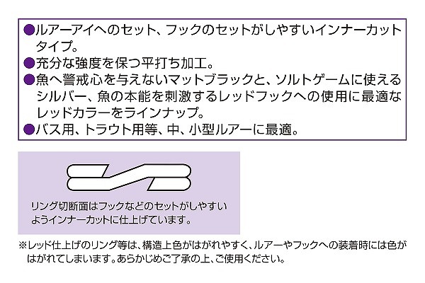 随所にこだわりを凝縮した、高品質スプリットリング。あらゆる中・小型ルアーに最適なライトクラスのスプリットリングです。バス・トラウトでの使用を考慮したマットブラックと、ソルトでの使用に最適なシルバーをラインナップ。●ルアーアイへのセット、フックのセットがしやすいインナーカットタイプ。●充分な強度を保つ平打ち加工。●魚へ警戒心を与えないマットブラックと、ソルトゲームに使えるシルバー、魚の本能を刺激するレッドフックへの使用に最適なレッドカラーをラインナップ。●バス用、トラウト用等、中、小型ルアーに最適。※レッド仕上げのリング等は、構造上色がはがれやすく、ルアーやフックへの装着時には色がはがれてしまいます。あらかじめご了承の上、ご使用ください。