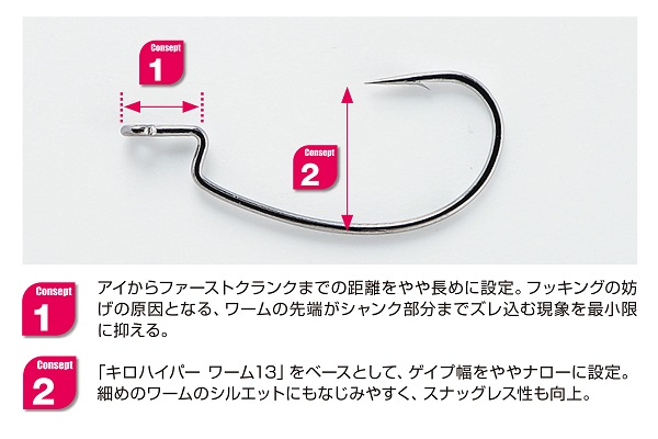 ロックフィッシュ狙いでのテキサスリグの作成に絶大な信頼を得る「ロックフィッシュリミテッド ワーム13S」をベースに、小型化するにあたって各部の仕様を見直し最適化した小型ヘビーワイヤーのオフセットフックです。ロックフィッシュ、チヌゲームを中心に、様々なソルトウォーターのターゲットに対応、特にマイクロベイトパターンや小型ワームでテキサスリグを組む際に本領を発揮します。どんなサイズの魚がヒットするかわからない海の釣りにおいては、備えあれば憂いなしの強い味方です。 ※掲載している商品の画像は代表画像を表示しています。また実物と色が違って見える場合があります。あらかじめご了承下さい。