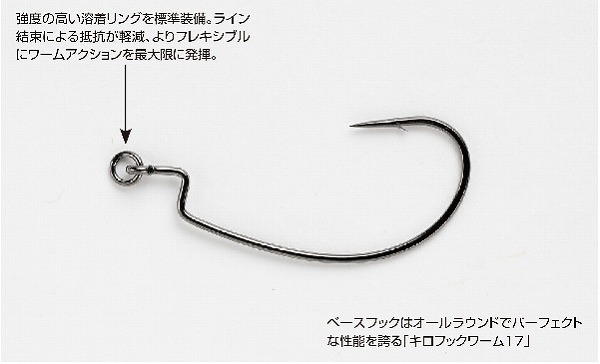 ワームが躍る。リングドオフセット。絶対的信頼のオフセットフック「Kgフック」をベースに、高強度なリングを装着。リングにラインを結ぶことでフックの自由度が増し、上下のアクションにこれまでに無いしなやかさをもたらします。クロー系ワームをメインとしたボトムでの倒れ込みアクションや、特にテキダンリグとの相性は抜群!小刻みなシェイクにしっかり追従し、ワームアクションを生かす抜群の組み合わせです。その他、「DS-6」や「DS-8」等のドロップシンカーをスプリットリングで装着することで簡易的にゼロダンリグも作成可能。