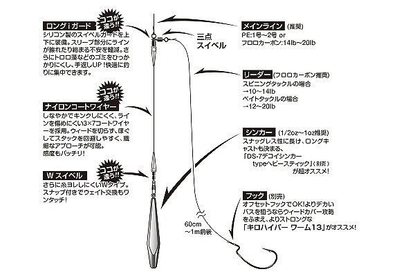 ウィードをほぐしてスタックを回避!琵琶湖キャロの決定版!遠投キャロライナリグ対応「琵琶湖キャロワイヤー」に、こだわりパーツを随所に採用した豪華版ともいえる仕様。ウィードを切るのではなく、ほぐして外しやすいナイロンコートワイヤーを採用し、よりシビアな状況に対応。さらにダブルスイベルやロングiガードを搭載し、トラブルを徹底排除。レコード級の一匹を獲る為に抜かり無し。●ウィードをほぐしてスタックを回避する3×7susナイロンコートワイヤー採用。●ウィードレス性のよいロングiガードでスイベル周辺をガード。●シンカー優先の飛行姿勢となり、リーダーが絡みにくくロングキャストが可能。●糸ヨレを大幅軽減するWスイベル採用。●お好みのシンカーをセット可能。■WIRE:#48(3×7=21Braid Nylon coated)■Swivel TOP:#4×5 UNDER:#5(Double)
