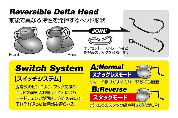 スナッグレス&スタック、2種類の特性をスイッチ可能なジョイントシンカー。お好みのオフセットフックをセットすることで、ジョイントリグが作成可能なフットボール系シンカー。デルタ形状ヘッドはスライド式のピンを抜いて反転させることで前後どちらでも使用可能。それぞれの形状特性から、すり抜けに優れたスナッグレスモードそして移動距離を抑えたスタックモードにスイッチ可能。これ一つで様々なシーンをカバーするバーサタイルジョイントヘッド。2022年、ヘビータイプが登場。バスフィッシングでは、さらにブ厚いヘビーマットでの貫通力を向上させ、またソルトウォーターの使用においては潮流の速いエリアや底がとりにくいディープエリアをカバー。●お好みのオフセットフックに装着可能な、スライドピン式ジョイントヘッド。●前後を入れ替えて使用できるスイッチシステム採用。それぞれの向きで異なる特性を発揮するデルタ形状のフットボール系ヘッド。●あらゆるワームカラーになじみ違和感を与えにくいガンブラック仕上げ。●感度のよいハードマテリアル(鉛合金)を採用