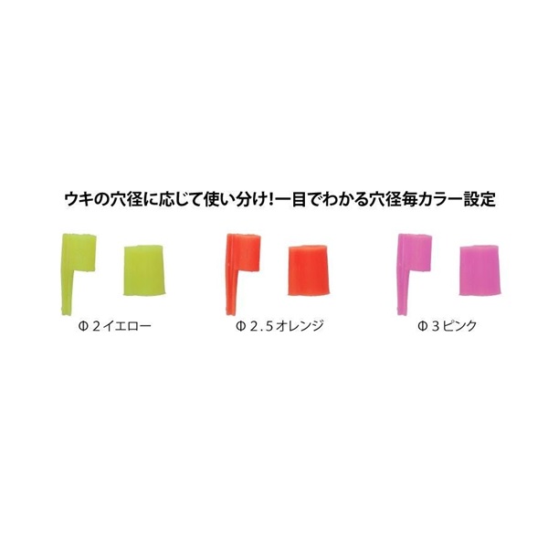 マズメの貴重な時間を逃さない!中通しウキ用の後付け発光体ホルダー。●仕掛けを切らずにつけ外しができる、中通しウキ用夜釣りパーツ。一切糸を切ることなく、昼間の仕掛けにそのまま差し込むだけで発光体を取り付けることができる、後付けタイプの中通しウキ専用発光体ホルダーです。ウキ止めやシモリ玉の有無は一切関係なくお使い頂くことが可能です。●発光体25サイズに対応。ウキにしっかりと挿し込める穴径専用軸と補強ホルダーで、発光体をがっちりホールド。発光体差し込みパーツ+補強ホルダーで発光体を挟み込んで使用します。魚が掛かっても本体・発光パーツいずれも脱落しにくい独自の構造です。●ウキの穴径に応じて使い分け!一目でわかる穴径毎カラー設定。セットするウキの穴径に合わせて選べる3サイズを用意。Φ2:イエロー・Φ2.5:オレンジ・Φ3:ピンクと色分けされているため、小物ケースに入れても、一目で使いたいサイズを判断することが可能です。