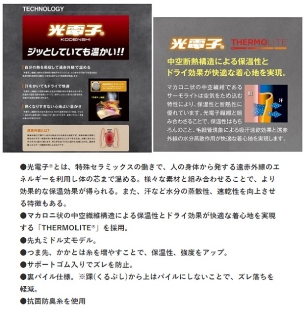 ●先丸ミドル丈モデル。●つま先、かかとは糸を増やすことで、保温性、強度をアップ。●サポートゴム入りでズレを防止。●裏パイル仕様。※踝(くるぶし)から上はパイルにしないことで、ズレ落ちを軽減。●抗菌防臭糸を使用