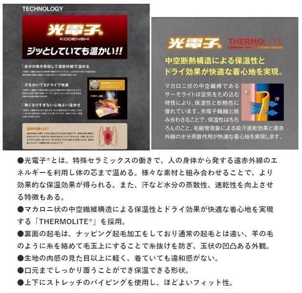 ●裏面の起毛は、ナッピング起毛加工をしており通常の起毛とは違い、羊の毛のように糸を絡めて毛玉上にすることで糸抜けを防ぎ、玉状の凹凸ある外観。●生地の肉感の見た目以上に軽く、着ていても違和感がない。●口元までしっかり覆うことができ保温できる形状。●上下にストレッチのパイピングを使用し、ほどよいフィット性。