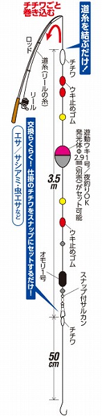 初めてでもかんたん、面倒な仕掛を丸ごとセット。予備仕掛2本付。 ●コンパクトロッドでOK!(エギングロッド・バスロッドでも)●夜釣りOK!発光体φ2.9mmセット可能!●遊動ウキ/ウキ下50cm - 4mまで対応。釣場や狙う魚のタナに応じて、ウキ下調整がかんたんにできます※掲載している商品の画像は代表画像を表示しています。また実物と色が違って見える場合があります。あらかじめご了承下さい。
