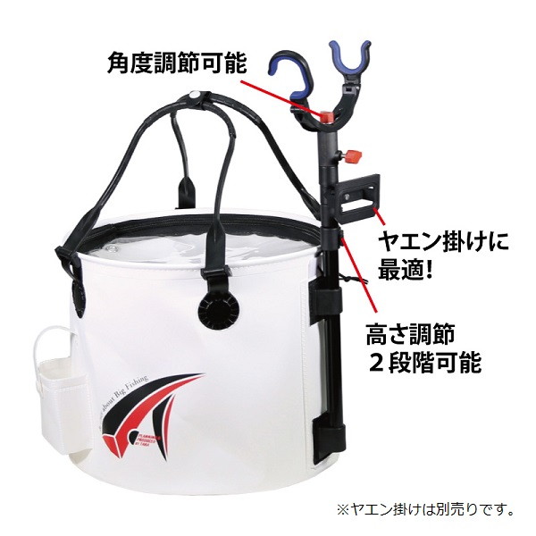 サイドに竿立て用ポール付のアジバケツ。補強プレート付で型崩れしにくい。