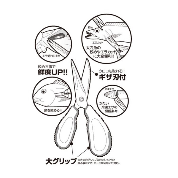 ●絞めに。エラ切りに。冷凍餌のカットに。ウロコ取りに。何でも使える万能バサミ。●厚刃・太刃で硬い部分も難なくカット。●大きなグリップで力が入りやすい。