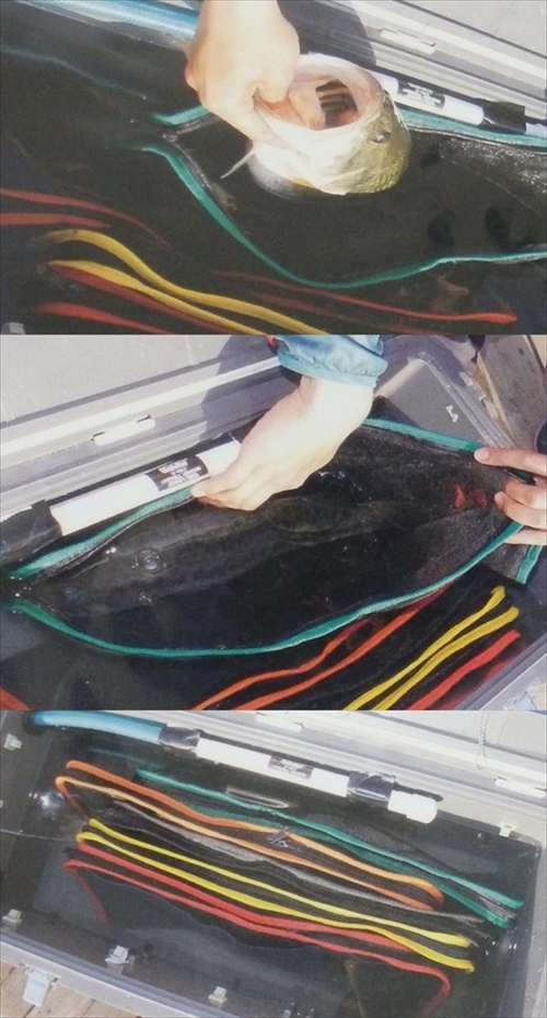 フィッシュプロテクトバッグに魚を入れることにより魚が落ち着きライブウェル内でのストレスやダメージを最小限に抑えることができます。●ライブウェルから魚が飛び出さない。(ロケットしない)●バッグのふちを色分けしているのでマーカーとして使用できる。●ウェイインバッグ等に移しかえる際、魚に触れずに移す事が可能。