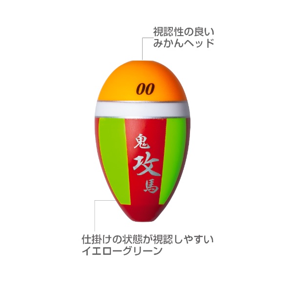 海面下の仕掛けの方向が読み取れ、ウキ全体の動きが見えるキバカラーの装いも新たに、「みかんヘッド」が登場。全天候タイプカラーで近年に多い海の色(薄い青・白っぽい青)には抜群の視認性を発揮します。従来の「鬼馬ウキ 攻」よりも、3mm大きくし、プラス表記(4+B〜B+BB)はスリム形状にし、単発表記(00〜3B)はファットタイプで、どちらも高重心ウエイトを採用しています。