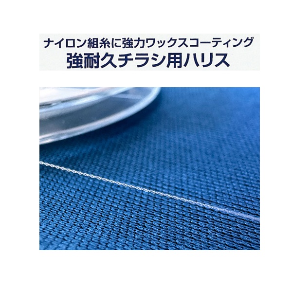 ナイロン組糸による強耐久チラシ用ハリス。●フジノ独自のAQコートにより、摩擦が起きにくく、強度が安定し、 ハリを結ぶ際にも安心。糸がらみが起きてもすばやくほどけ、糸グセがつかないから快適。●しなやかで鮎にからみやすく、糸グセがすぐに取れるというチラシ用ハリスに必須な特性を取得。●組糸構造なので、浮力が発生し、根掛かりしにくい。さらに、組糸ならではの弾力があり、クッション効果大。