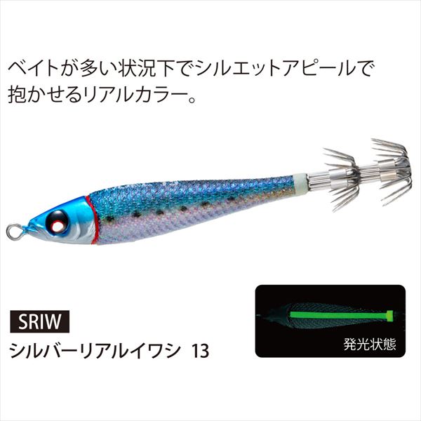 サイズ:20号(75g) ベイトが多い状況下でシルエットアピールで抱かせるリアルカラー。 ダイレクトにアクションを伝達するアイ フラッシングアピールするフラッシュアイ イカの視覚にも訴えるリアルヘッド 使いやすいシンプルなラウンドボディ ツツイカの細い足も確実に掛ける14本?2段の段差フック 存在感をアピールする「スポットグローライン」を採用