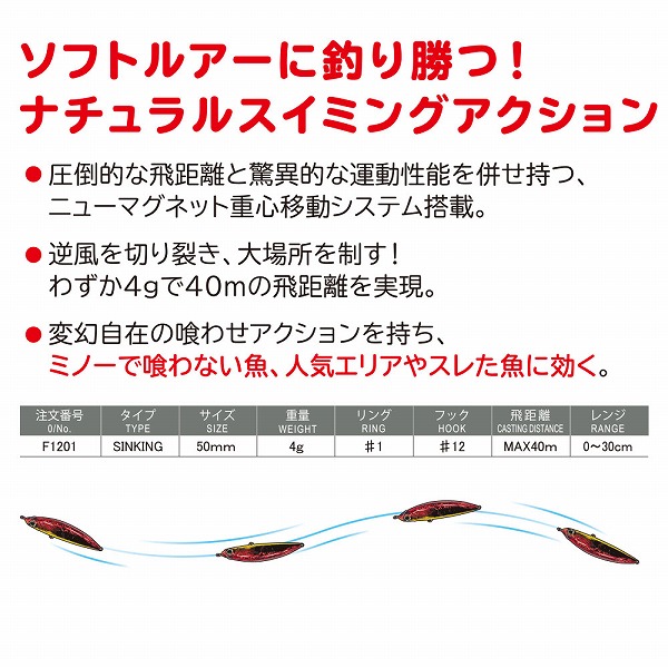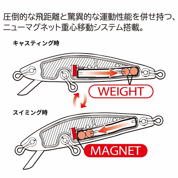 ソフトルアーに釣り勝つ!ナチュラルスイミングアクション◆圧倒的な飛距離と驚異的な運動性能を併せ持つ、ニューマグネット重心移動システム搭載。◆逆風を切り裂き、大場所を制す!わずか4gで40mの飛距離を実現。◆変幻自在の喰わせアクションを持ち、ミノーで喰わない魚、人気エリアやスレた魚に効く。