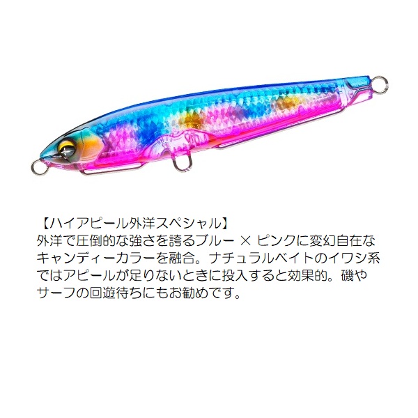 爆発的飛距離+レンズの閃光!(International Patent)遥か彼方のターゲットを狙い撃つ!!半永久的に輝くリアルレンズを搭載。遠浅エリアや水面直下狙いに最適なシンキングペンシル!●薄めのボディ形状で風を切り裂く抜群の遠投性能●浮き上がりが速い設定により、遠浅エリアや水面直下をスローでじっくり狙える●ラインを引っ張りながらバックスライドローリングフォールするので着底が分かり易い