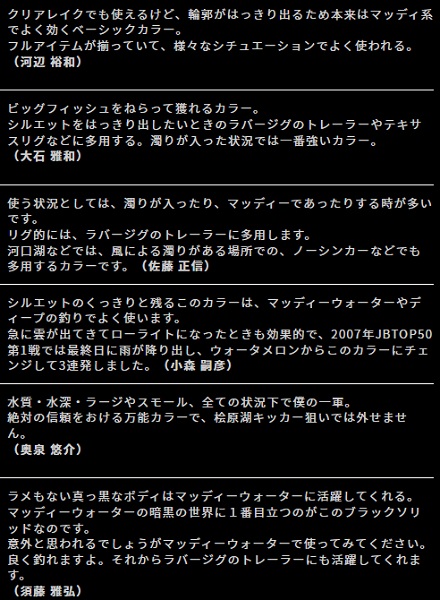 タフな状況下でも最後の最後までバスが反応するライブベイトに近い微弱ライブ系波動を放つレッグワームは、ボディの縦と横の異なるリブとバイブレーションテールで、バスにとって「食べたい!」と思わせる弱った小魚の動きを超リアルに再現します。