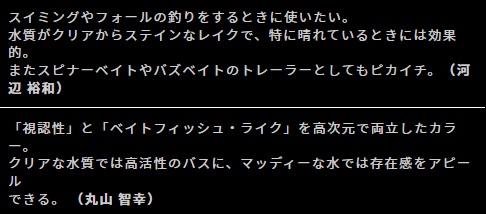 タフな状況下でも最後の最後までバスが反応するライブベイトに近い微弱ライブ系波動を放つレッグワームは、ボディの縦と横の異なるリブとバイブレーションテールで、バスにとって「食べたい!」と思わせる弱った小魚の動きを超リアルに再現します。