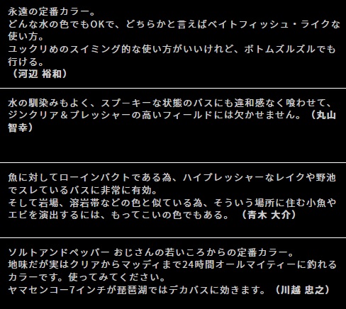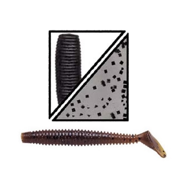 タフな状況下でも最後の最後までバスが反応するライブベイトに近い微弱ライブ系波動を放つレッグワームは、ボディの縦と横の異なるリブとバイブレーションテールで、バスにとって「食べたい!」と思わせる弱った小魚の動きを超リアルに再現します。