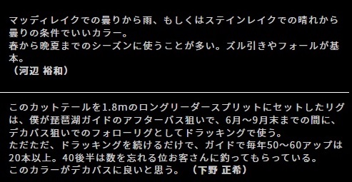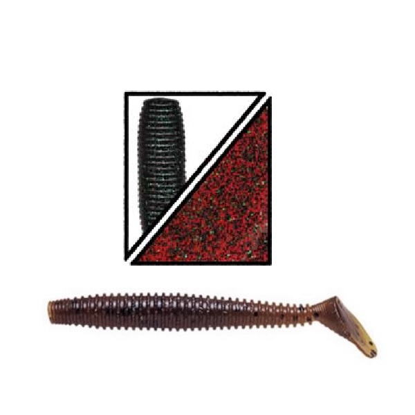 タフな状況下でも最後の最後までバスが反応するライブベイトに近い微弱ライブ系波動を放つレッグワームは、ボディの縦と横の異なるリブとバイブレーションテールで、バスにとって「食べたい!」と思わせる弱った小魚の動きを超リアルに再現します。