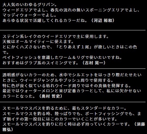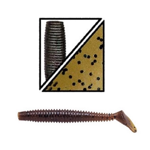 タフな状況下でも最後の最後までバスが反応するライブベイトに近い微弱ライブ系波動を放つレッグワームは、ボディの縦と横の異なるリブとバイブレーションテールで、バスにとって「食べたい!」と思わせる弱った小魚の動きを超リアルに再現します。