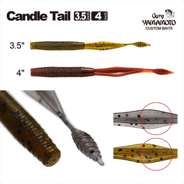 フィッシュアロー×ゲーリーヤマモト×深江真一 コラボ第3弾!キャンドルテールは、ネコリグ、ダウンショット、ライトキャロにベストマッチのボリューム&アクション! 縦刺し、横刺しで異なるアクションをするデザインの十字形キャンドルテールは、あらゆるフィールドに対応。深江氏がこだわった、ネコリグでのクイックなアクションは、特徴的なテール先端のふくらみが時間差でアクションする事で、バスに学習させない効果があります。また、ギルにつつかせる事で、ワームの存在感を自然にアピールしバスにスイッチを入れる事も出来ます。フォー※掲載している商品の画像は代表画像を表示しています。また実物と色が違って見える場合があります。あらかじめご了承下さい。