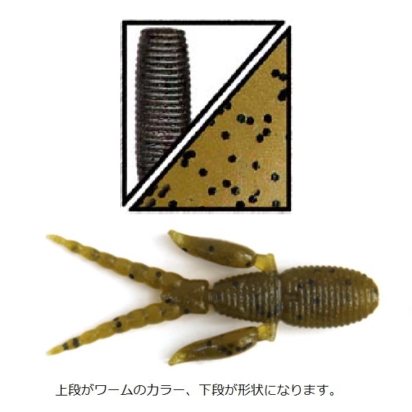 スモールラバージグ使いの名手として知られる青木大介プロが、スモールラバージグのポテンシャルを最大限に引き出す為に開発。特徴は2本の触角と大きな爪。その触角は大介シェイクやタカシェイクのような超小刻みなシェイクに敏感に反応し、その微波動で弱小生命体としてバスに認識させることができ、フォール時にも自然にバイブレーションを出すことによりハイプレッシャーレイクのバスを見事に騙す事ができます。さらに、触角による左右の微波動に加え、大きな爪による縦方向のアクションが生み出す波動をバスに伝えることで、バスに関心を持たせ