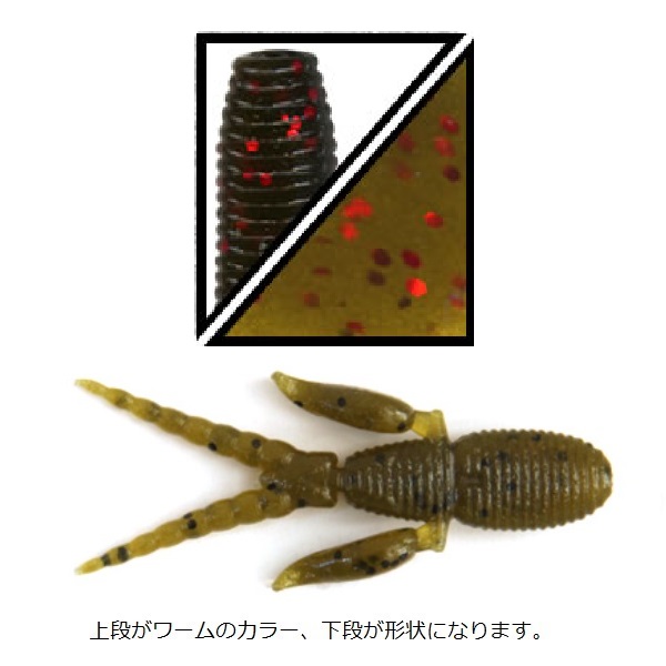 スモールラバージグ使いの名手として知られる青木大介プロが、スモールラバージグのポテンシャルを最大限に引き出す為に開発。特徴は2本の触角と大きな爪。その触角は大介シェイクやタカシェイクのような超小刻みなシェイクに敏感に反応し、その微波動で弱小生命体としてバスに認識させることができ、フォール時にも自然にバイブレーションを出すことによりハイプレッシャーレイクのバスを見事に騙す事ができます。さらに、触角による左右の微波動に加え、大きな爪による縦方向のアクションが生み出す波動をバスに伝えることで、バスに関心を持たせ