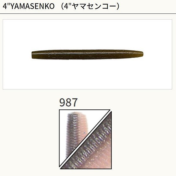 2”〜7”のヤマセンコーは大きさが違うだけでほぼ同じデザインです。バスのサイズや水の透明度、フィッシングプレッシャーやバスのコンディション、ベイトのサイズなどで使い分けていくとよいでしょう。ヤマセンコーはノーシンカーを最も得意としますが、テキサスリグで使用すると、ヤマセンコーでなければ入っていかないカバーが多く存在します。こういったポイントでは最後の切り札となるでしょう。また、キャロライナリグでも有効で、琵琶湖などのビッグレイクでは、岸からの遠投スタイルでも高い実績があります。フリーリグにおいても、水平フォールするヤマセンコーは相性抜群です。フリーにフォールさせてからボトムを這う姿にバスは反応してくれるでしょう。オフセットフックをセットしてノーシンカーで使うとき、軽いネイルシンカーをフックの逆側へセットしてやると、バックスライドリグとしても使えます。※掲載している商品の画像は代表画像を表示しています。また実物と色が違って見える場合があります。あらかじめご了承下さい。