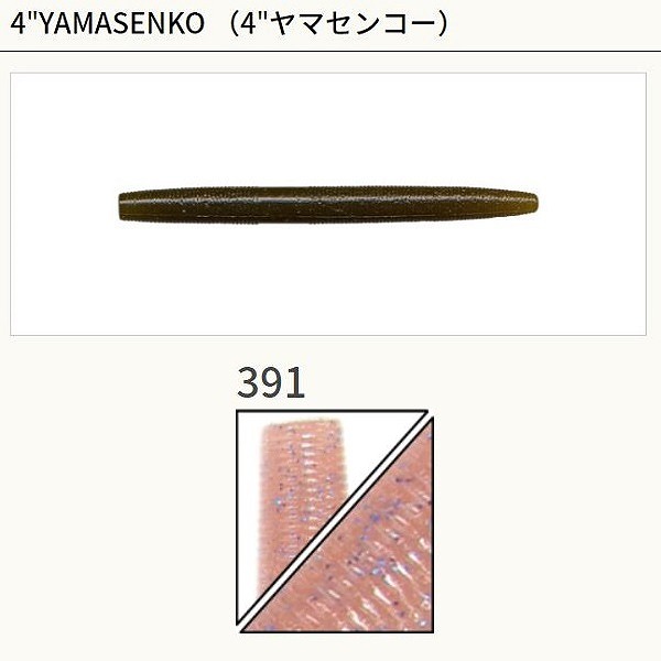 2”〜7”のヤマセンコーは大きさが違うだけでほぼ同じデザインです。バスのサイズや水の透明度、フィッシングプレッシャーやバスのコンディション、ベイトのサイズなどで使い分けていくとよいでしょう。ヤマセンコーはノーシンカーを最も得意としますが、テキサスリグで使用すると、ヤマセンコーでなければ入っていかないカバーが多く存在します。こういったポイントでは最後の切り札となるでしょう。また、キャロライナリグでも有効で、琵琶湖などのビッグレイクでは、岸からの遠投スタイルでも高い実績があります。フリーリグにおいても、水平フォールするヤマセンコーは相性抜群です。フリーにフォールさせてからボトムを這う姿にバスは反応してくれるでしょう。オフセットフックをセットしてノーシンカーで使うとき、軽いネイルシンカーをフックの逆側へセットしてやると、バックスライドリグとしても使えます。※掲載している商品の画像は代表画像を表示しています。また実物と色が違って見える場合があります。あらかじめご了承下さい。