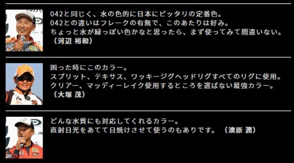 ジグヘッドリグやダウンショット、ジグトレーラーとしておススメです。ラージマウスバスのほか、野尻湖、檜原湖のスレたスモールバスに威力を発揮し、海の小物、ブルーギル等の小物釣りにも最適なサイズです。