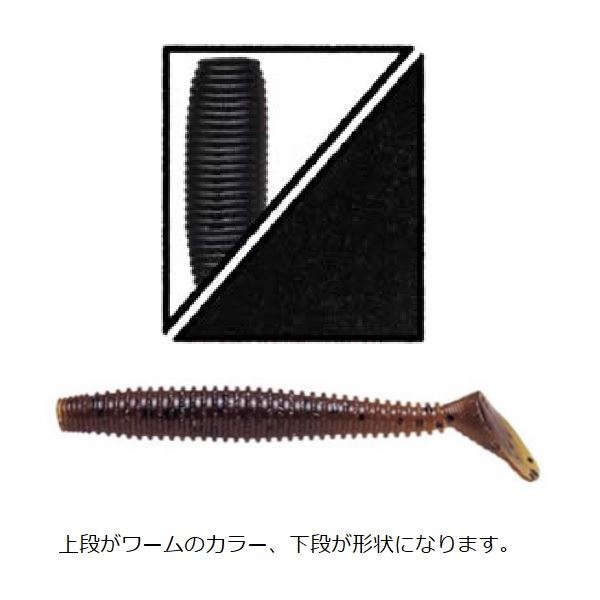 タフな状況下でも最後の最後までバスが反応するライブベイトに近い微弱ライブ系波動を放つレッグワームは、ボディの縦と横の異なるリブとバイブレーションテールで、バスにとって「食べたい!」と思わせる弱った小魚の動きを超リアルに再現します。フックサイズ#3のオフセットフック、もしくはマスバリで、ダウンショットリグやライトキャロライナリグ、ジグヘッドなどで使用する。日本全国のフィールドに対応したサイズ感で、季節を問わず使うことができる。【Text by 小森嗣彦】クリアレイクでも使えるけど、輪郭がはっきり出るため本来はマッディ系でよく効くベーシックカラー。フルアイテムが揃っていて、様々なシチュエーションでよく使われる。(河辺 裕和)