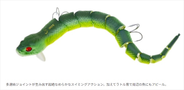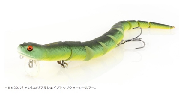ヘビを3Dスキャンしたリアルシェイプトップウォータールアー。多連結ジョイントが生み出す超絶なめらかなスイミングアクション。加えてラトル音で周辺の魚にもアピール。口元とリップのアイでレンジ変化が可能。リップに繋げるとまるで本物のヘビが表層を大きなS字を描きながら泳ぐリアルな引き波を演出。