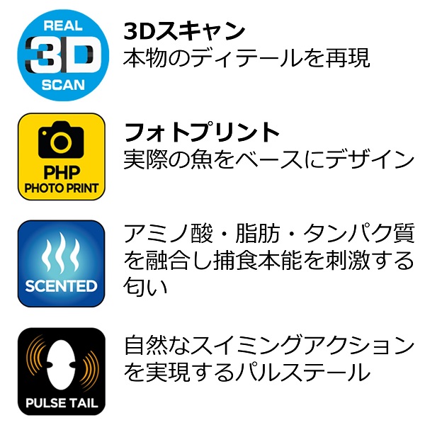 魚を3Dスキャンしたリアルシェイプスイムベイト。本物かと見まがう波動を生み出すパルステール。モデレートシンキングモデル。ボトムも攻めやすいトップフック仕様。ラトルチューブやシンカー等が挿入可能なテールホール。※4inchのみボディにラトルが内蔵(取り出し不可)