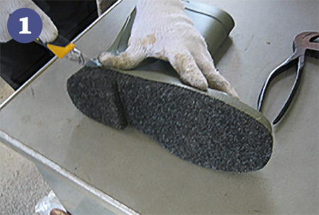 ブーツと交換用フェルトソールに一度リバレイボンドを塗り完全に乾かします。